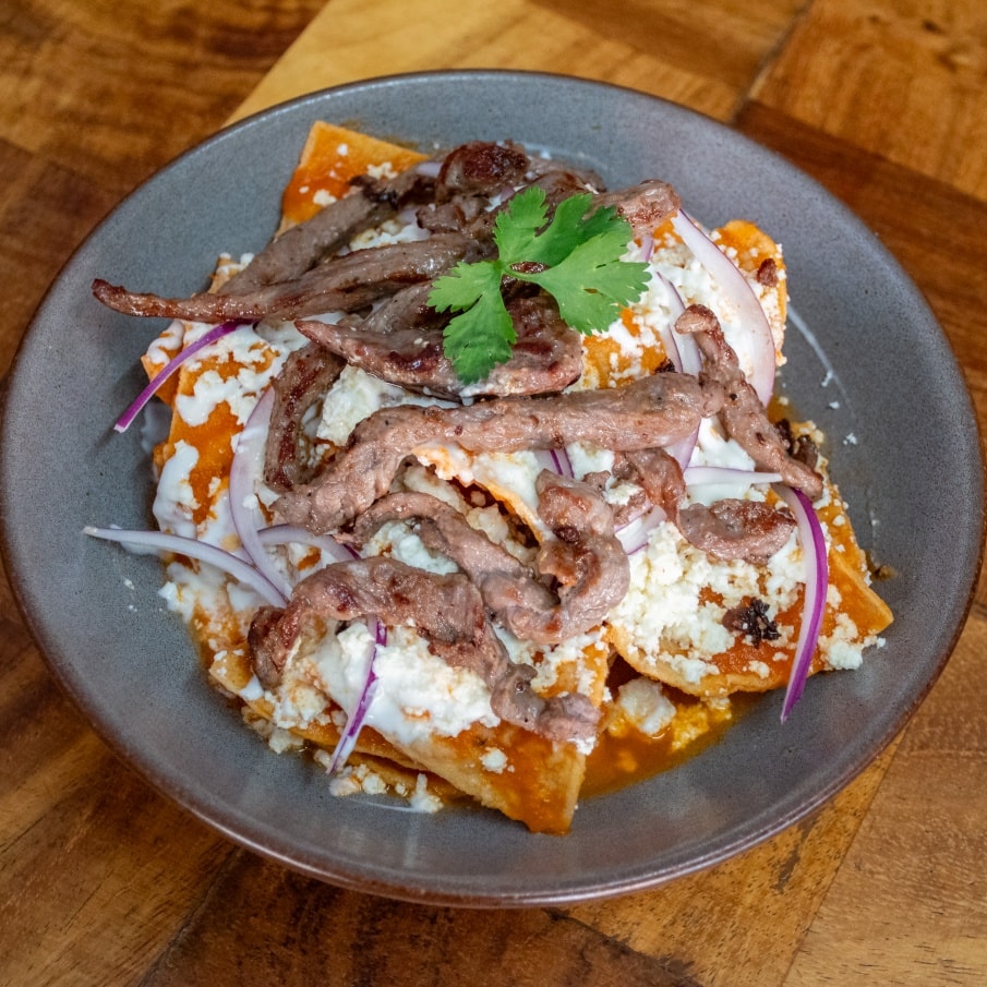 Crujientes chilaquiles en salsa roja, acompañados de tasajo tradicional oaxaqueño: carne asada al carbón, tierna y llena de sabor. Se sirven con crema, queso, cebolla encurtida y un toque de cilantro. Un desayuno con carácter y tradición.