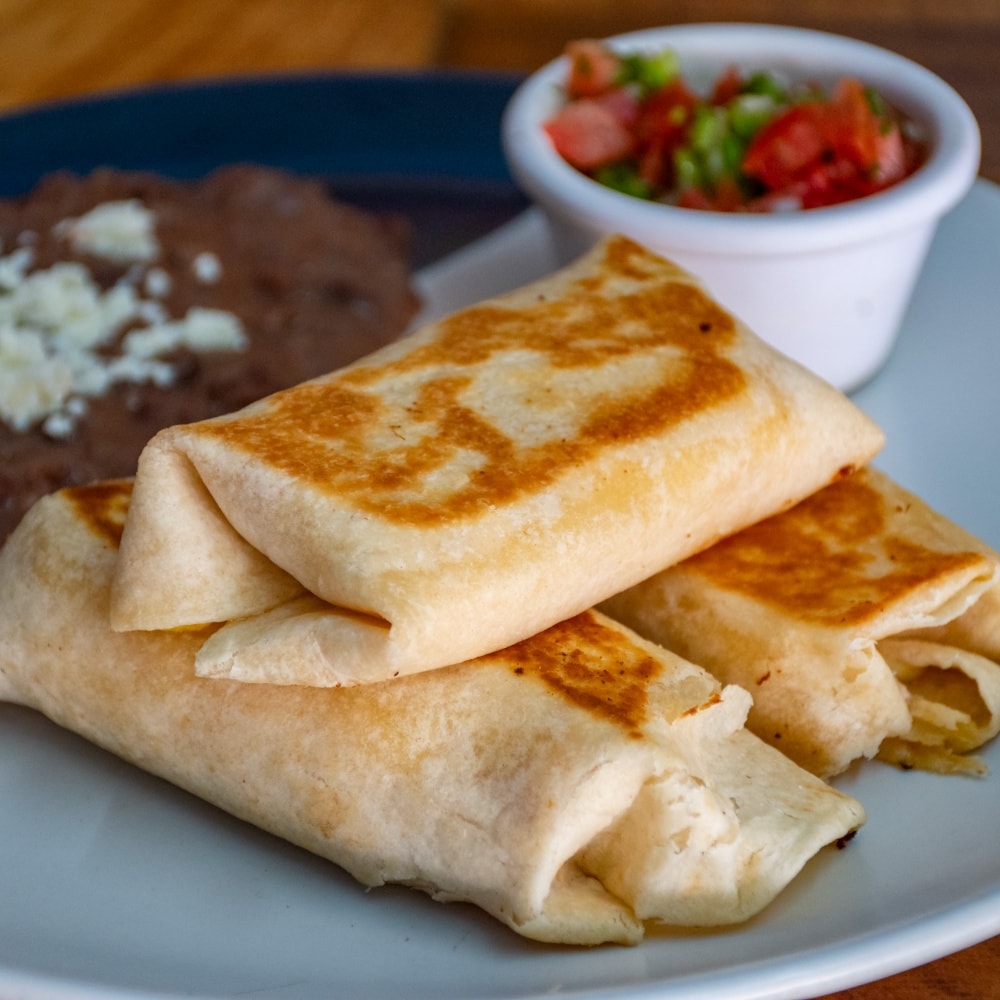 Tortillas de harina suaves y calientes envuelven un relleno abundante de frijoles refritos sazonados al estilo casero. Cada bocado se complementa con el frescor del pico de gallo